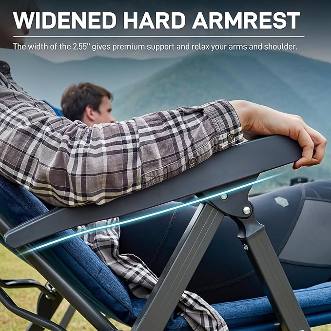 Med fokus på luksus og komfort har denne foldestol til haven en tyk polstring (6 cm), 4-trins justerbart ryglæn og høj ryg (66 cm), så du kan nyde en blød og behagelig siddeoplevelse. De højkvalitets ben i aluminium-jern-legering gør stolen let, mens den stærke stålramme i ryggen giver sikkerhed. Solide armlæn gør det lettere at rejse sig – en fordel for ældre brugere.